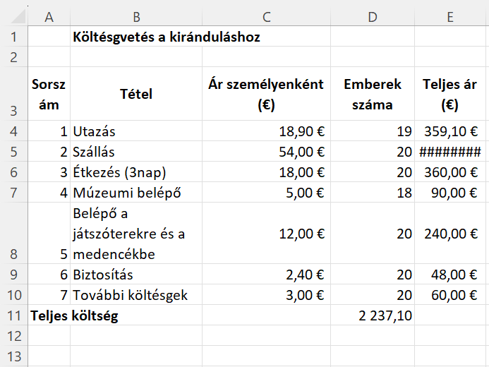 A budget.xlsx fájl tartalmaz egy táblázatot, amely felvázolja az iskolai kirándulások költségvetését. Íme egy példa a táblázatból.